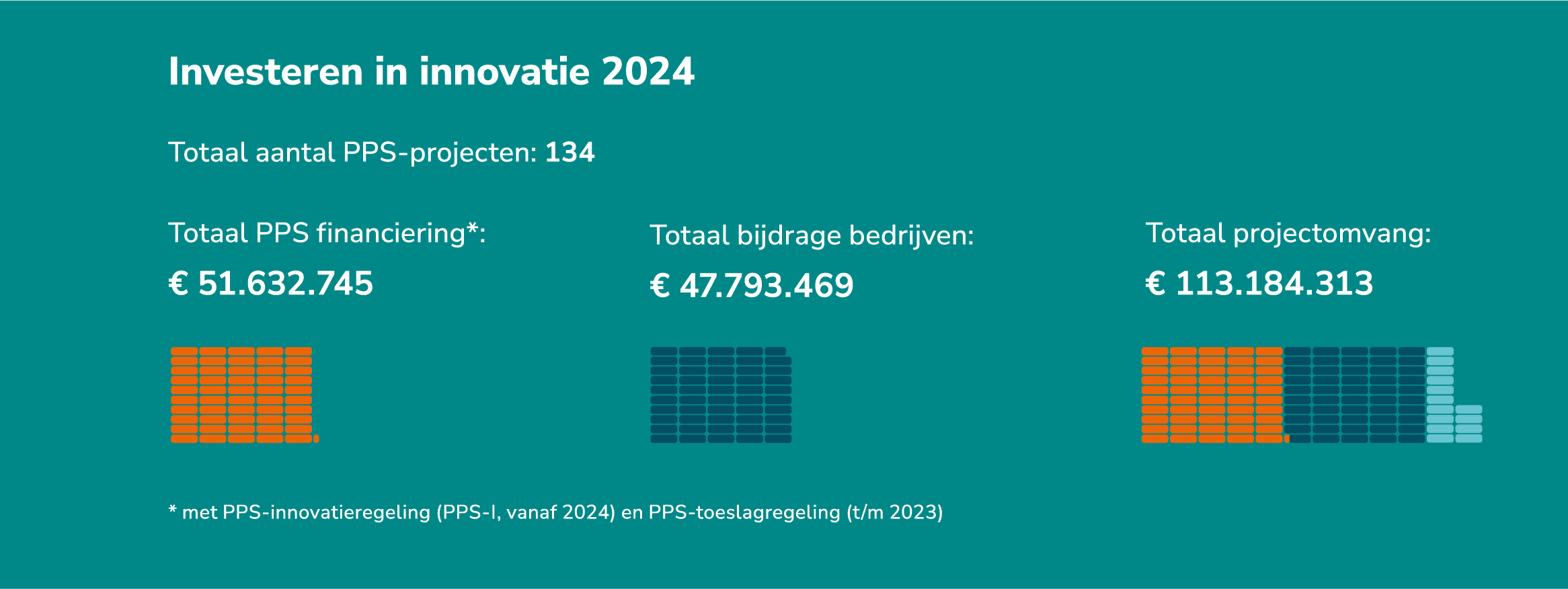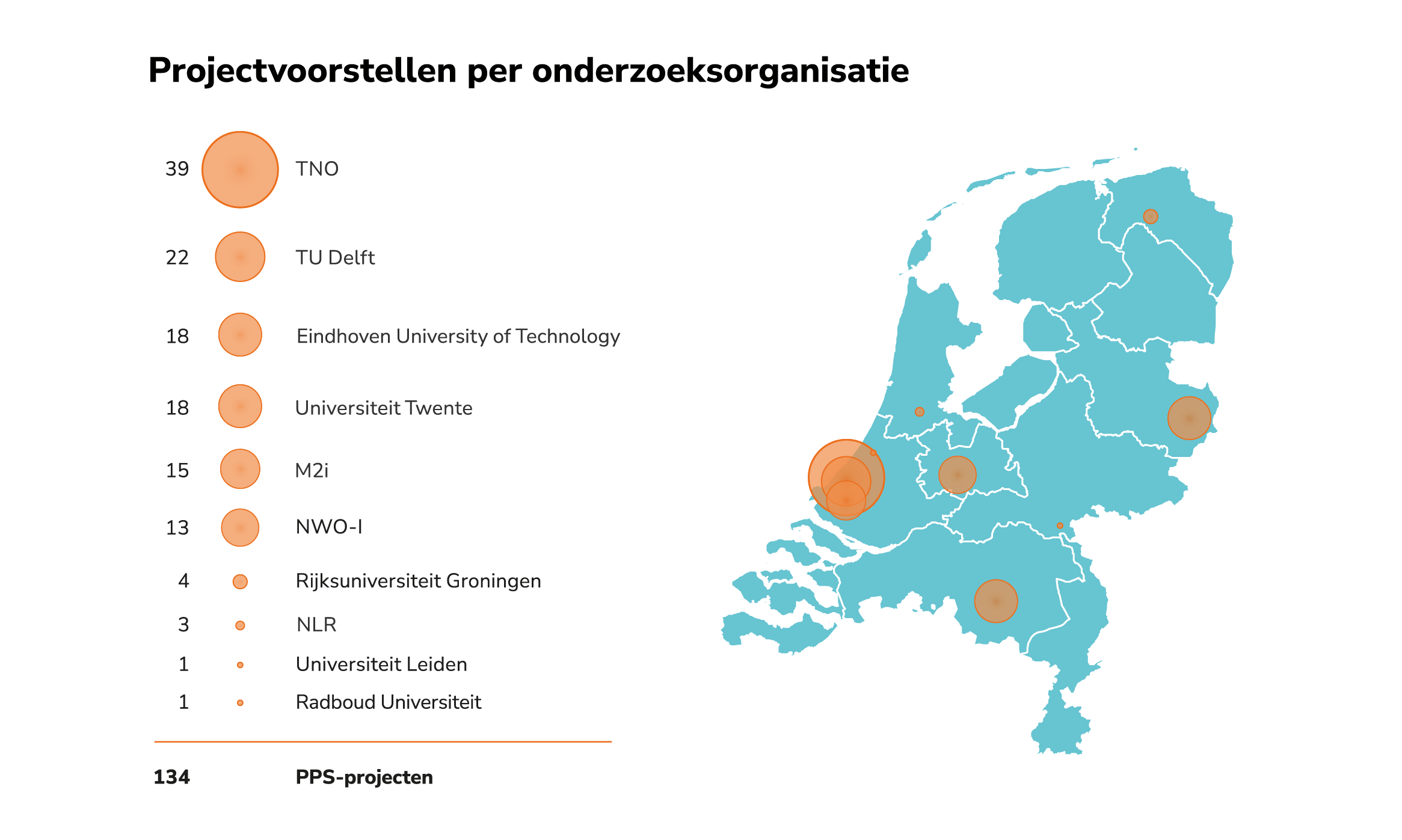 We zijn trots op de groei, duidelijke focus op technologische innovatie, de urgente transities en de diversiteit in type onderzoek in onze publiek-private innovatieprojecten. In 2024 heeft Holland High Tech 134 projecten gefinancierd met meer dan 55 miljoen euro PPS-toeslag en meer dan 50 miljoen bijdrage van private bedrijven.